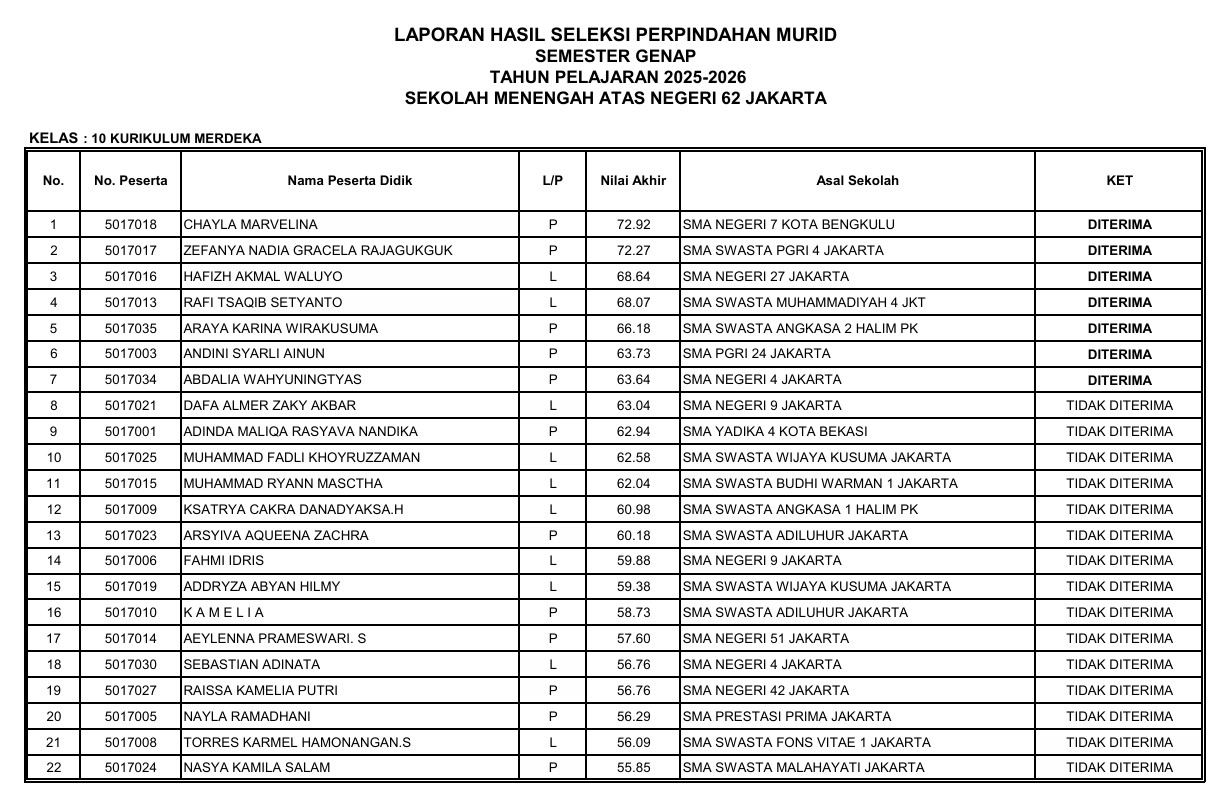 PENGUMUMAN HASIL MUTASI TAHAP 1 SMTR GENAP KELAS 10 & KELAS 11 T.P. 2025/2026